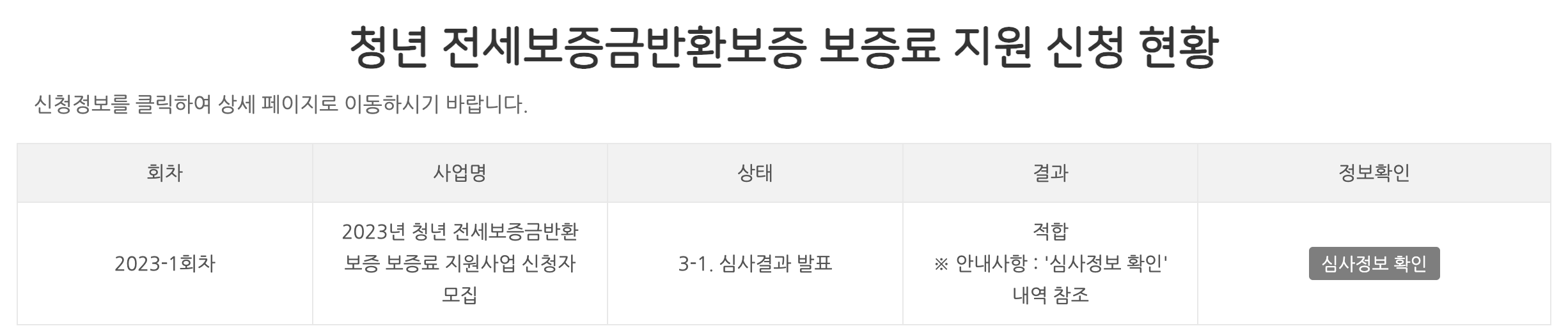 안내대로 청년몽땅정보통 사이트에 접속하면, 이런 창이 나오고 심사정보 확인을 클릭합니다.