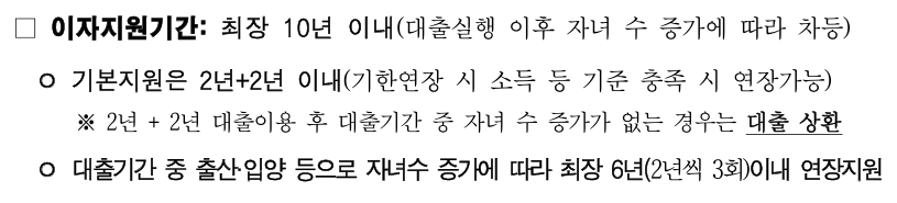 대출 후 자녀계획이 없다면 4년이 됐을 때 상환해야하며, 자녀수 1명 증가마다 2년씩 더 연장할 수 있습니다(;;;).